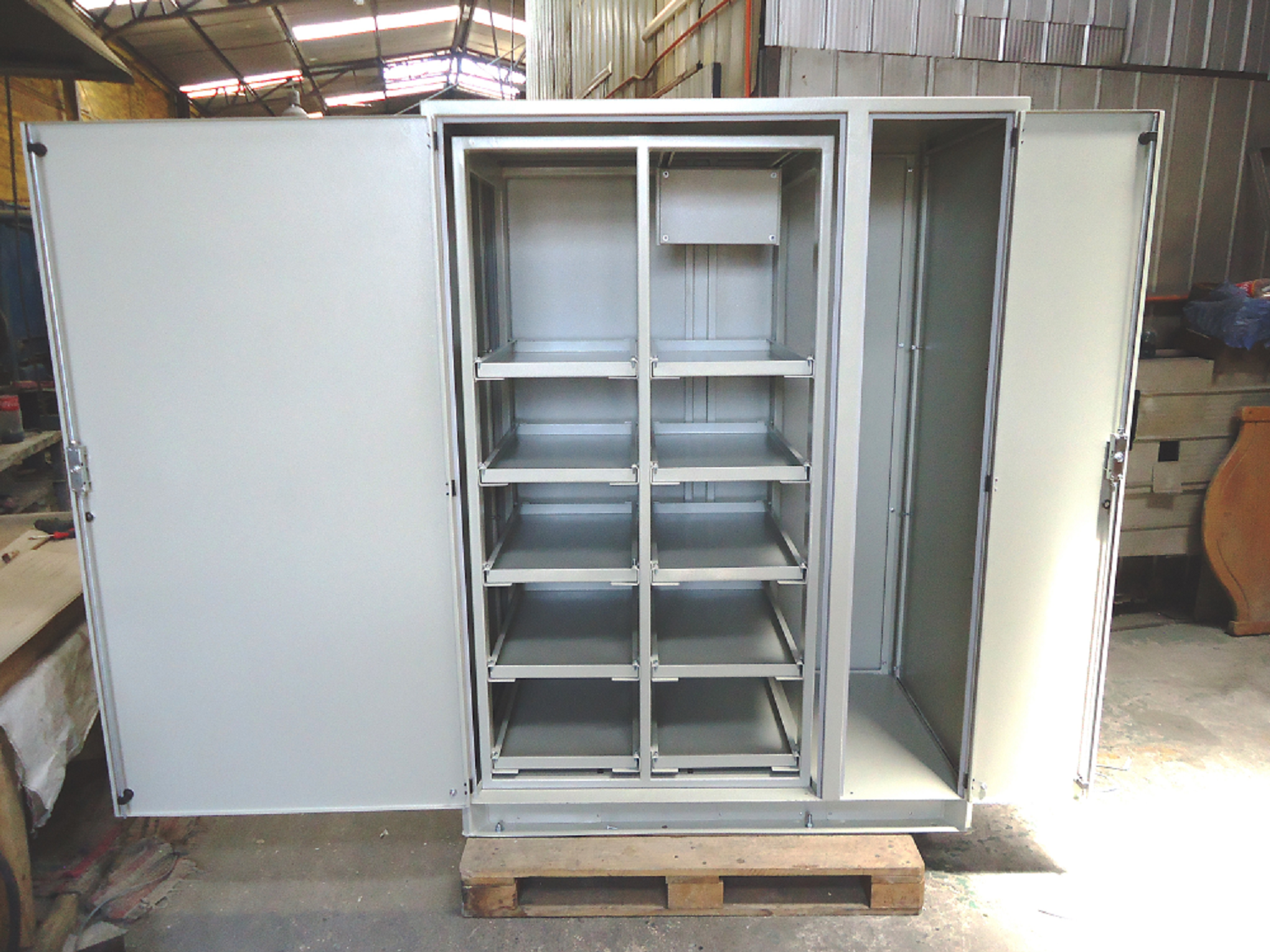 Gabinete Rack, estructura interna de bandejas reforzadas para baterias
