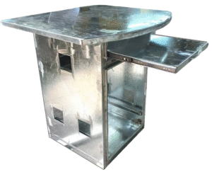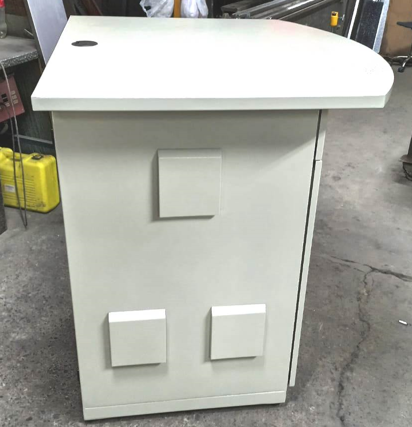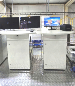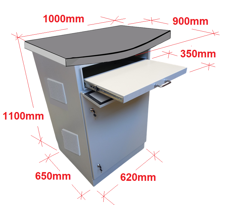 Gabinete especializado para Estacion de Trabajp , fabricado en Acero Galvanizado. Cumple con estándares IP-55 y NEMA 4, con pintura electroestática RAL 7032. Diseñado con compartimentos separados para , teclado, servidor impresora y UPS, permitiendo acceso independiente. Incluye 2 ventiladores de 220 V con filtro de polvo y humedad anti insectos (150 x 150 mm) de fácil recambio. Y Termostato de Temperatura Regulable .Ofrece protección y rendimiento óptimo en condiciones ambientales desafiantes.